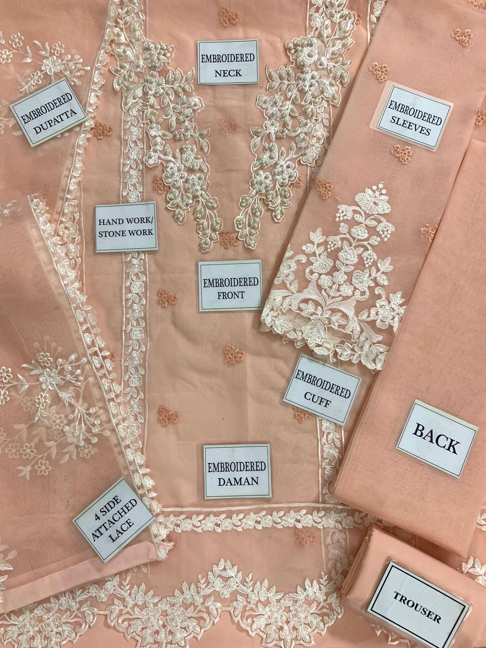 EMBROIDERED ORGANZA FRONT WITH EMBROIDERED NECK PATCH EMBELLISHED WITH ADDA WORK AND HANDAWORK ALONG WITH CUTWORK DAMAN PATCH