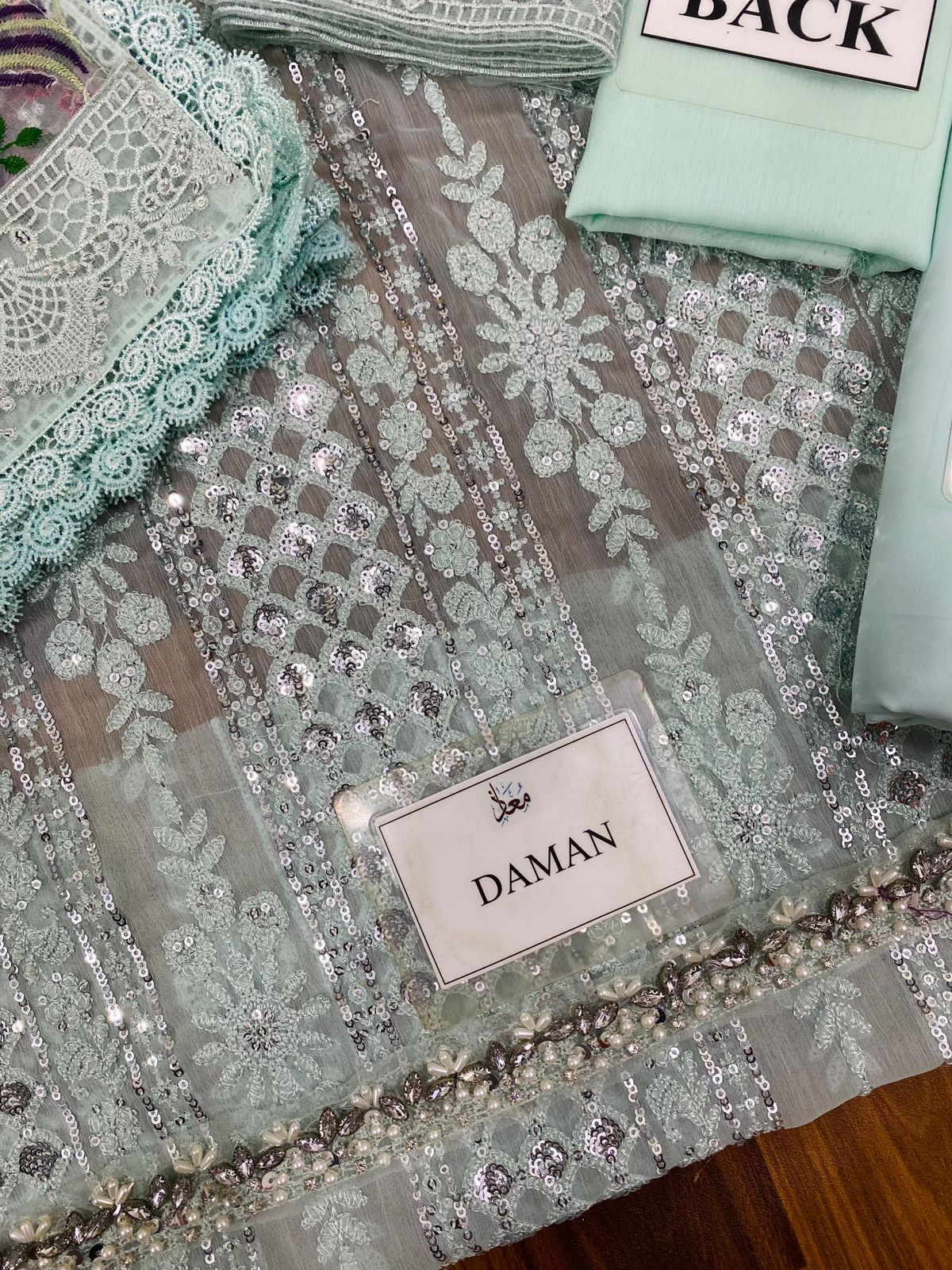 Chiffon embroidered sequence front with handwork on neckline and border